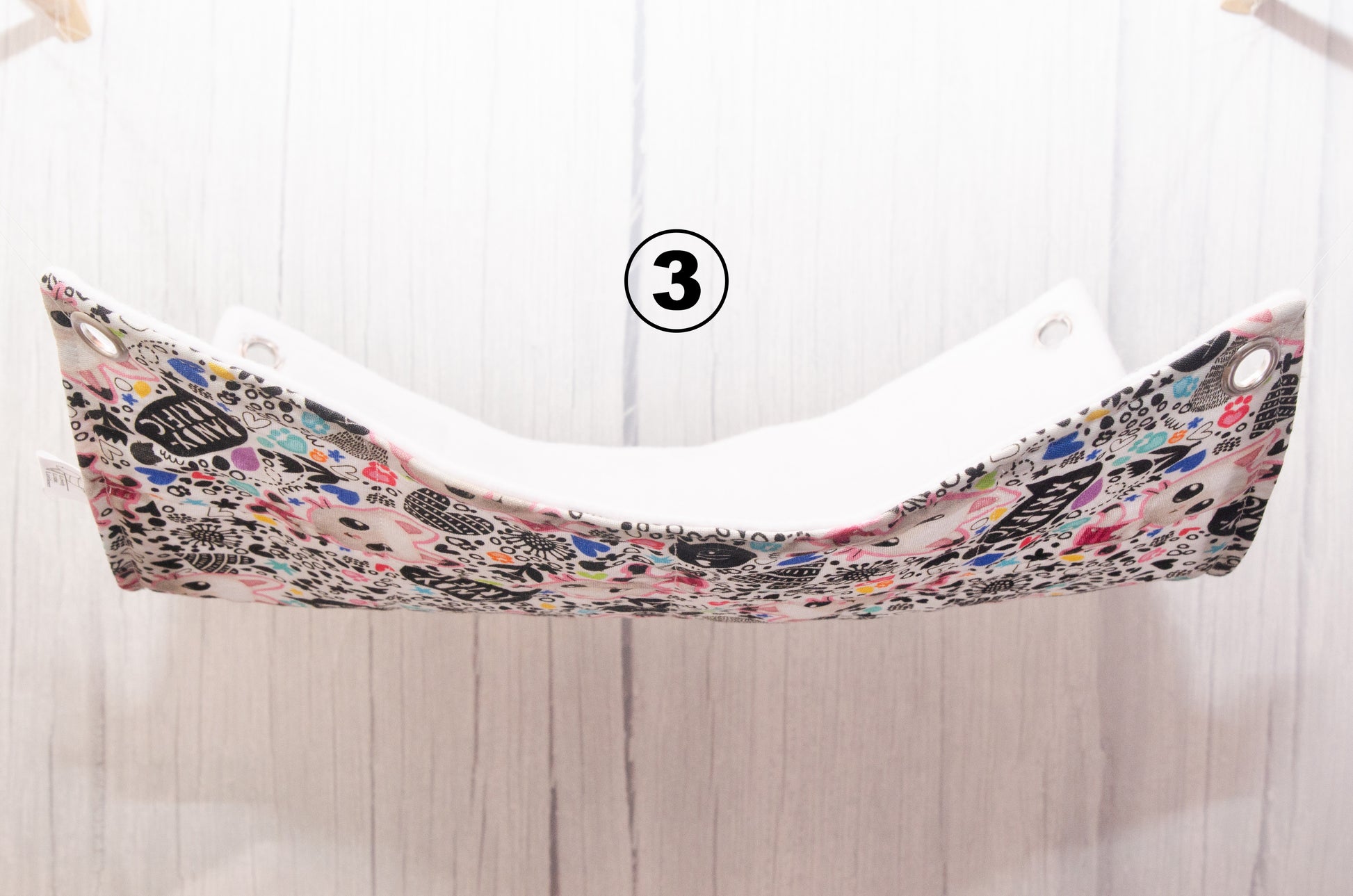4. Rainbow Black - Small double hammock (27cm x 27cm so slightly bigger than small, slightly smaller than medium). Cotton drill and black fleece fabric.