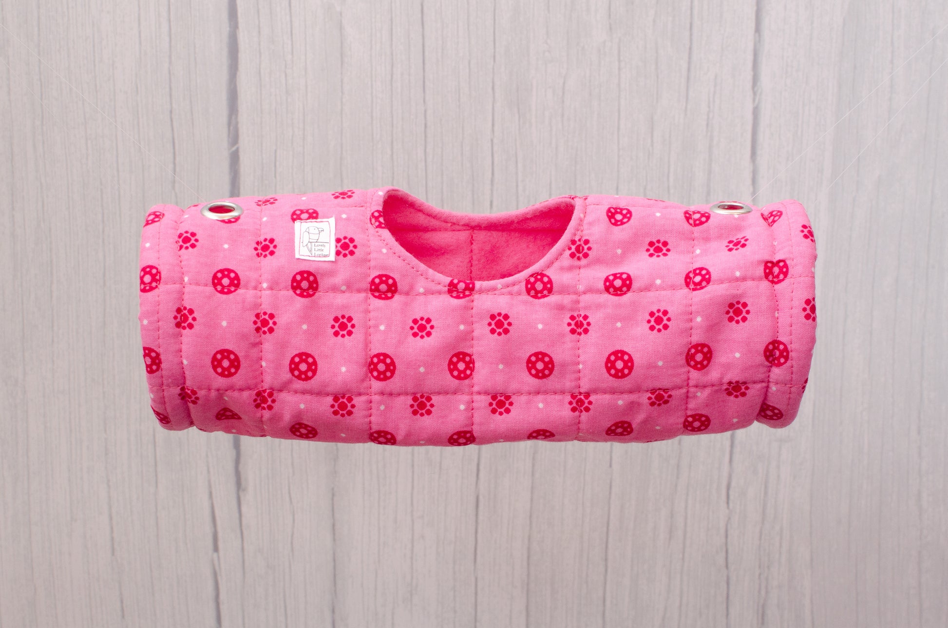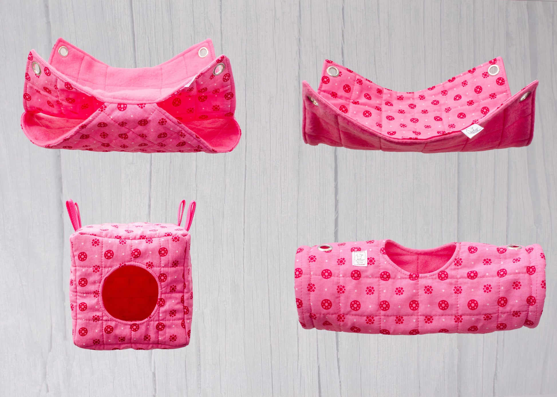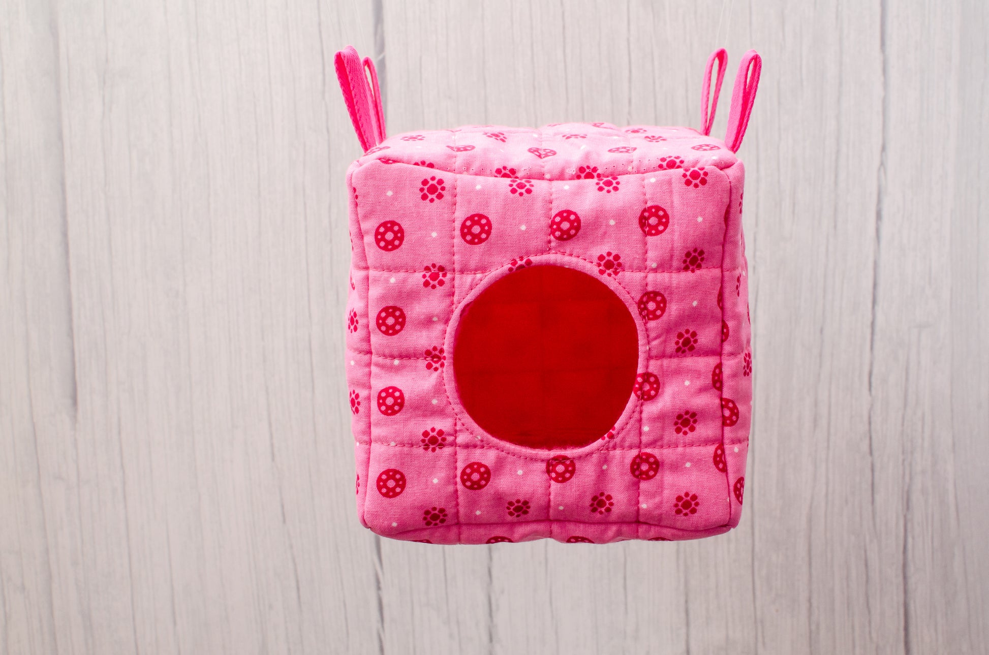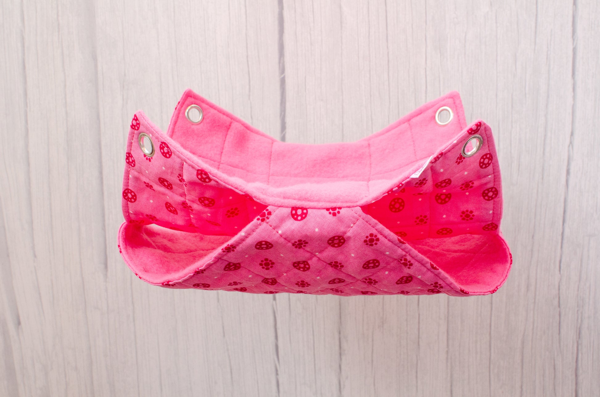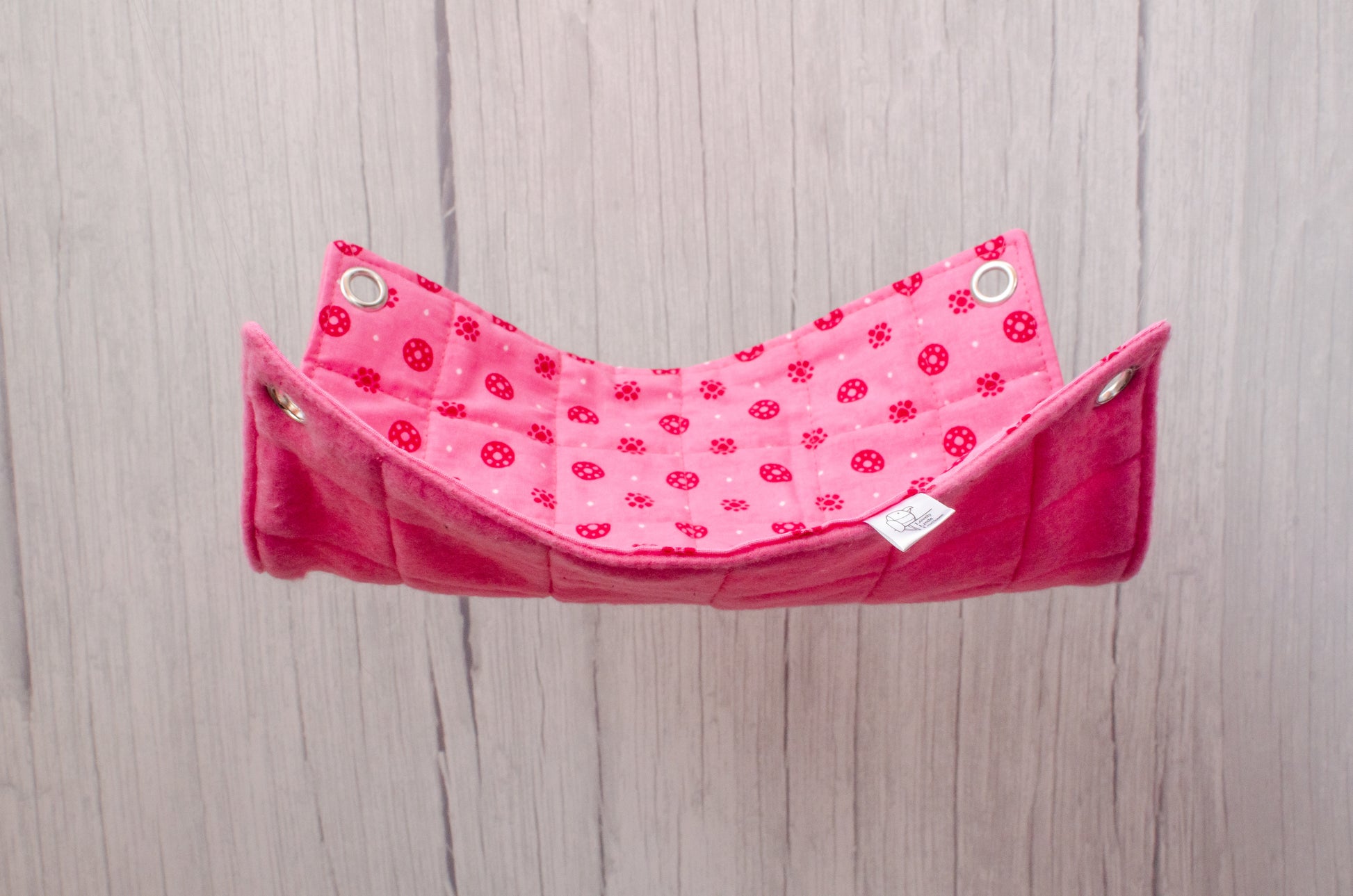 These hammocks are made from cotton and warm fleece. Reversible (flat and double, not cube or tunnel) so you can you choose the cotton fabric for summer and cosy fleece for cooler weather.