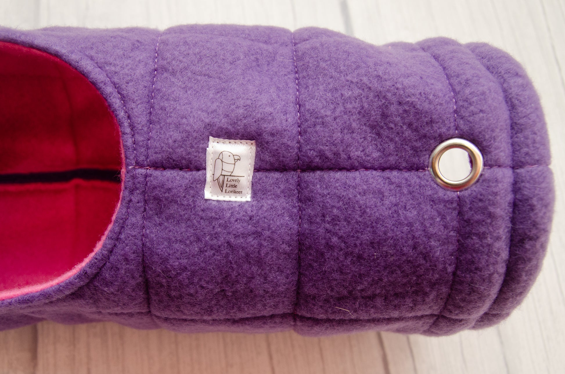All Lovely Little Lorikeet hammocks come with quilting as standard to help prevent chewing and tunnelling between layers. The cube hammock comes with tabs and all the other versions (flat, double and tube) all come with durable metal eyelets.